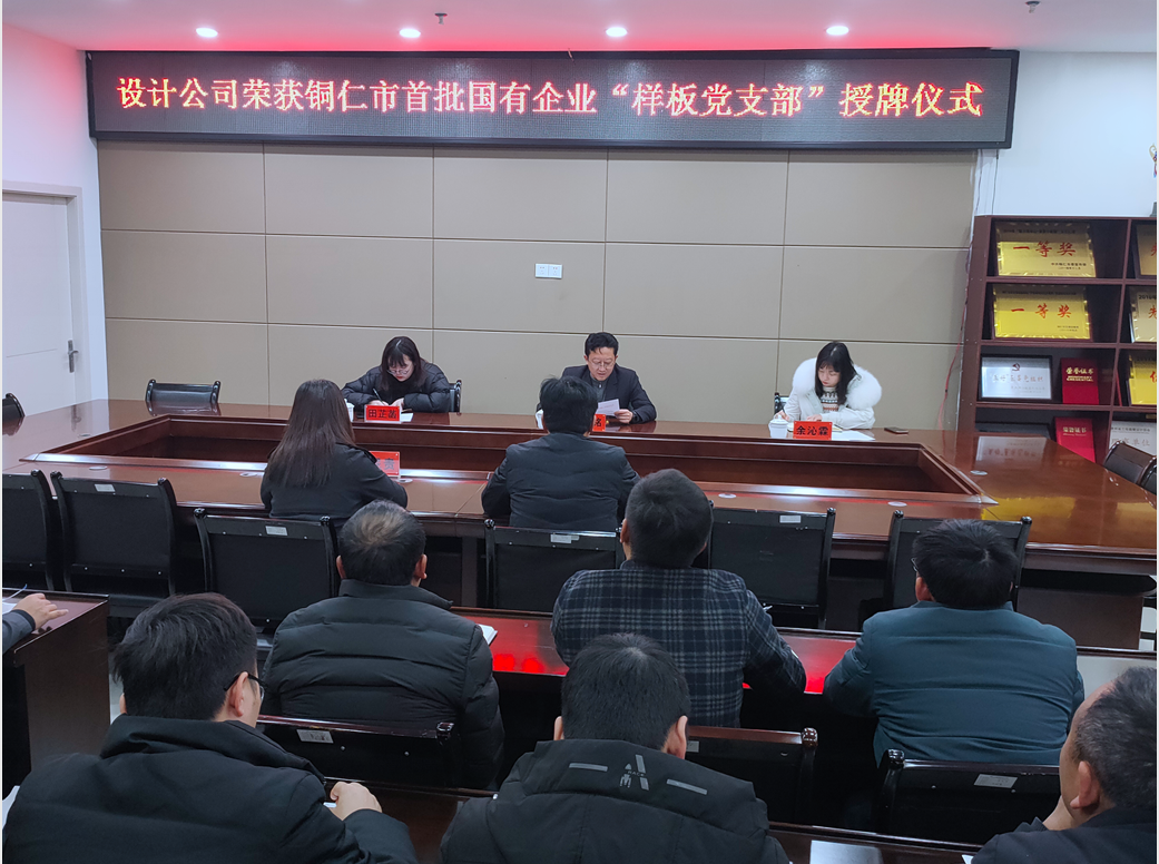 授牌仪式于2月26日在公司党员活动室举行。铜仁交旅集团党委委员、副总经理肖剑铭同志受铜仁交旅集团党委书记、董事长蔡江同志委托宣读《关于开展首批国有企业“样板党支部”授牌活动的通知》并为设计公司授牌。授牌仪式由公司党支部书记、总经理刘兴连主持。